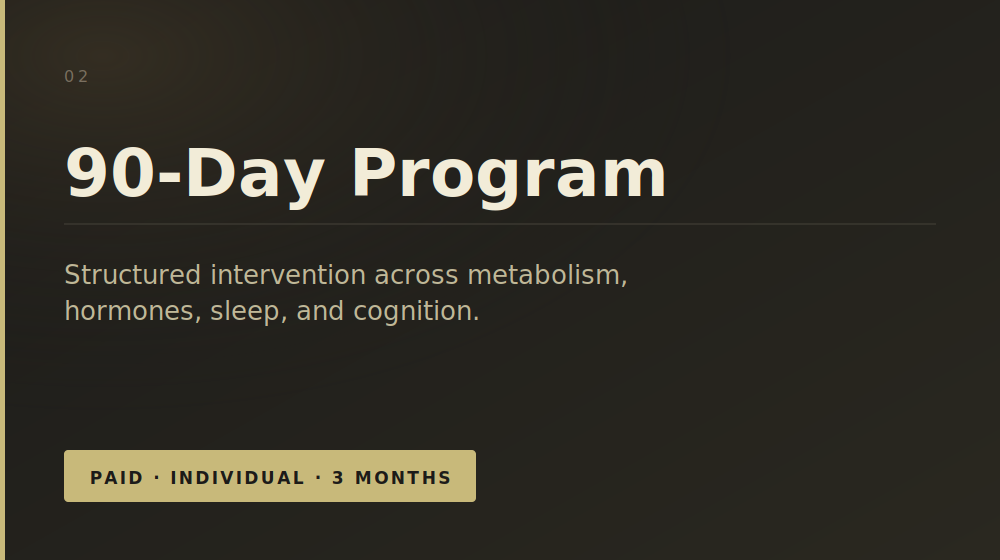 Work with me 1:1 to optimize biomarkers, healthspan, weight, wellness, energy, hormones, and daily performance.
